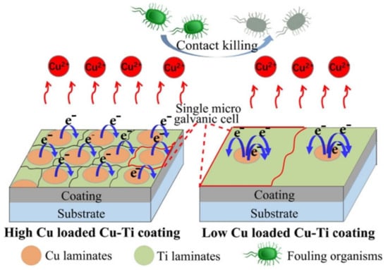 - Tian, J.; Wang, K.; Xu, K.W.; Luo, X.T.; Shao, G.S.; Li, C.J. Effect of coating composition on the micro-galvanic dissolution behavior and antifouling performance of plasma-sprayed laminated-structured Cu-Ti composite coating. Surf. Coat. Technol. 2021, 410, 126963. [Google Scholar] [CrossRef]