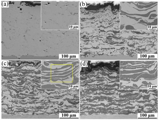 Figure 5 illustrates the antifouling principle of the alternating layers of Cu and Ti. The micron-scale layered structure forms multiple small micro-galvanic cells within the coating, and as the Cu increases, the number of these micro-galvanic cells also increases. When the Cu content is low, the anode area of each micro-galvanic cell is small, leading to higher current density, which accelerates the dissolution of the anode. Conversely, the anode area becomes relatively larger as the Cu content increases, reducing current density and slowing the dissolution rate. Therefore, coatings with higher Cu content exhibit better antifouling performance. Additionally, as the Cu dissolves, the Ti layers gradually become exposed. The Ti layers are removed by seawater flow, exposing new Cu and Ti layers, forming new micro-galvanic cells, and achieving a self-polishing effect.