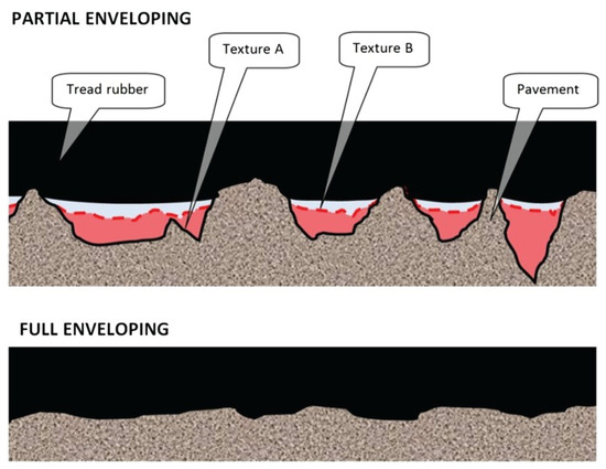 The texture of the road surface significantly affects the deformation of the tire tread elements, and therefore contributes to the increase in rolling resistance. Deformations also occur on the surface side, but due to the fact that the mechanical impedance of the surface is much greater than that of the tire, the deformations of the former are much smaller. Many previous studies have tried to describe the interactions between the tire and the road surface [6,7,8]. When talking about the influence of surface texture on rolling resistance, we cannot forget about the phenomenon of so-called enveloping. Too little elasticity of the tread elements does not allow them to be deformed to accurately reflect the shape of the surface. Contact with the surface is limited only to the highest parts of the surface (aggregate peaks). The tire tread is pressed and deflected by the highest points of the surface, but due to the stiffness of the rubber compound and the belt, its elements do not penetrate into the surface texture recesses but create “bridges” between adjacent peaks. As a result, air pockets and channels are formed on the contact patch of the tire with the surface. In the figure below we can see how two different texture profiles A and B deflect the tire in the same way, but the air pockets and channels differ to a large extent (Figure 2) [9].