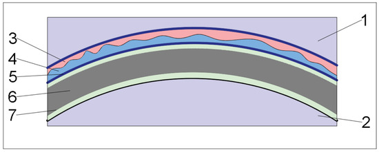 Figure 6. Diagram showing the method of forming a replica of a road surface for running machines with an external drum (1, 2—mold halves; 3—elastic coating constituting a negative reproduction of the road surface; 4—top layer of the replica (gelcoat layer mixed with finely cut glass fiber); 5—leveling layer of epoxy resin; 6—layer of epoxy casting resin; 7—layer consisting of glass fiber mats immersed in epoxy resin).