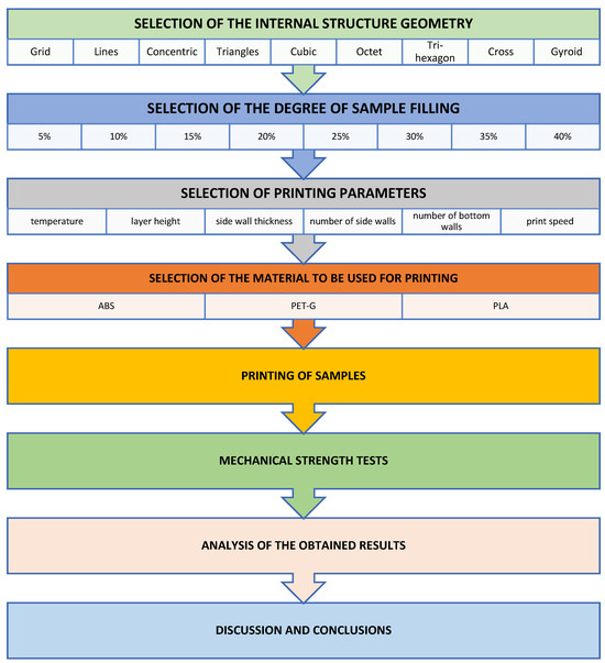 For this purpose, predefined fill geometries from the library of the 3D printer software were used, and several types of fill were chosen.