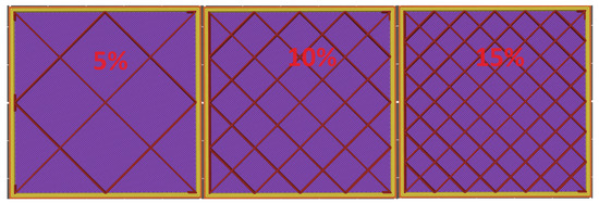 Figure 8. “Grid” geometry of pavement replica fillings (5%, 10%, and 15% of infill density).