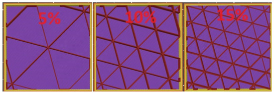 Figure 10. “Triangles” geometry of pavement replica fillings (5%, 10%, and 15% of infill density).