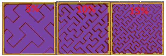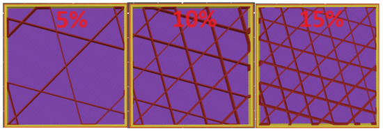 Figure 12. “Cross” geometry of pavement replica fillings (5%, 10%, and 15% of infill density).