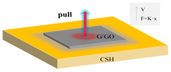 Schematic diagram of detachment model of G on C-S-H substrate. The yellow area is the C-S-H substrate, the gray area is the graphene layer, and the stress area is indicated by the red arrow.