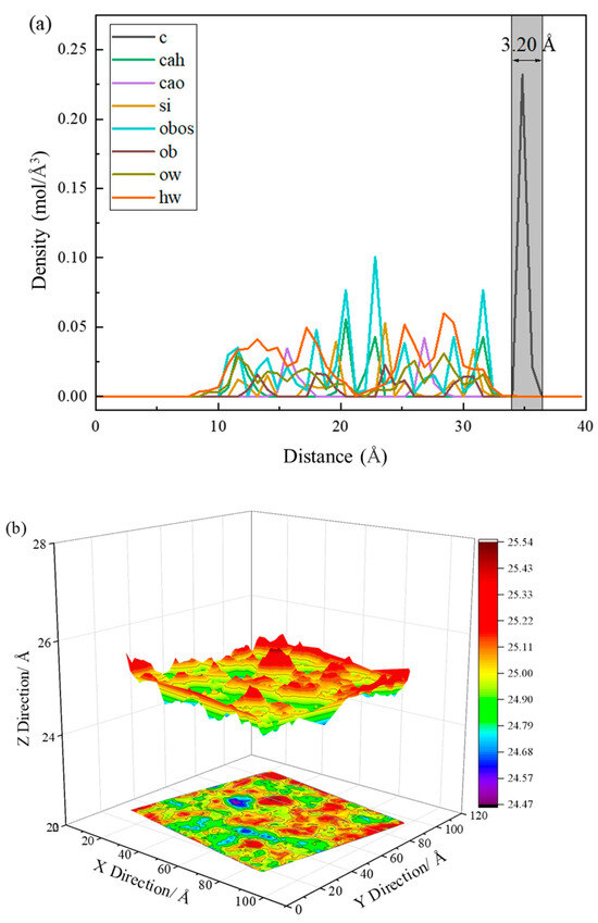 The properties of materials depend on their own structural characteristics, so the atomic density distribution inside G and C-S-H composites in the z direction was analyzed as shown in Figure 1a. c represents carbon atoms in G, and cah, cao, si, obos, ob, ow, and hw represent interlayer calcium ions, intra layer calcium ions, silicon atoms, unbridged oxygen atoms, bridged oxygen atoms, oxygen atoms in water, and hydrogen atoms in water, respectively, in C-S-H. The shaded part of the graph is the distribution (Figure 3a) of graphene carbon atoms in the z direction, which can reflect the degree of deformation of G. The results show that the height of the G distribution region in the z direction is about 3.20 Å, and there is no direct contact with the surface of C-S-H, indicating that C-S-H has a small adsorption effect on G, and the degree of structural deformation of G is small, which can also be reflected in Figure 3b because there is only a van der Waals force between G and C-S-H. The combination of the two is weak.