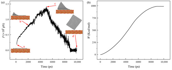 Figure 4a shows the dynamic debonding process of G on a C-S-H substrate, where a, b, c, and d are simulated snapshots of 0 ps, 2000 ps, 5000 ps, and 10,000 ps, respectively. The simulation results show that G can debond stably on a C-S-H substrate under the action of external forces, and some discontinuous folds and ripples appear in the process of debonding. In order to quantitatively demonstrate the debonding process, the time evolution of tension F and tension work W was recorded as shown in Figure 4. Tensile force can be regarded as feedback of the interaction between the G sheet and C-S-H, and is directly related to interfacial stress transfer. Tensile force acts on G, causing G to debond on the C-S-H substrate, and the tensile force performs work on it during the debonding process. Therefore, the debonding force F and the debonding work W can be used to characterize the debonding energy of G. The tension curve increases at first and then decreases with time, reaching a maximum Fmax = 1.42 × 103 pN at 5000 ps, and the work curve increases rapidly at first and then slowly and finally tends to be horizontal, reaching a maximum Wmax = 989.50 Kcal/mol at about 9000 ps. The maximum debonding force Fmax occurs at the moment when G is debonding at C-S-H, indicating the largest force barrier that G needs to overcome for debonding. The final work Wmax appears when G is completely debonding on the C-S-H substrate, indicating the external energy required for complete debonding of G. Therefore, in this study, we mainly discussed the debonding behavior of G on a C-S-H substrate from the above two indicators.