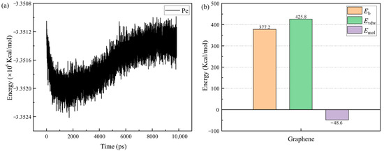 The debonding of G on a C-S-H substrate depends on the binding effect of C-S-H and G; the stronger the binding effect, the higher the difficulty of G on a C-S-H substrate, and the stronger its debonding ability. Potential energy (Pe) is energy stored in a system that can be released or converted into other forms of energy when the system is deformed. Figure 5a shows the change of system potential energy with time in the process of G debonding. The results show that the system potential energy in the process of debonding presents a slightly increasing trend with time, which is the result of work performed by external forces. The increased potential energy reflects the bonding strength provided by G when interacting with the C-S-H substrate.