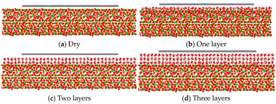 Due to the hydrophilicity of the G and C-S-H surfaces, invading water is easily fixed on the interlayer void between the G and C-S-H substrates. In order to clarify the influence of humidity on the interfacial bonding strength between G and C-S-H, four systems with different water contents were constructed, including a dry condition, one layer of water molecules, two layers of water molecules, and three layers of water molecules present on the interlayer void as shown in Figure 6. To ensure structural stability, we fixed the C-S-H substrate. We performed a tensile test after 1ns of relaxation of the system.