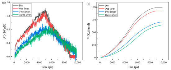 Figure 7 shows the time evolution of debonding tension F and the debonding tension work W of G under different water contents. The results show that the tension first increases and then decreases with an increase in time, and the work gradually increases with an increase in time and finally tends to a constant value. The tensile force of G debonding under the Dry and One-layer models reached the maximum value at about 5000 ps, which was 1.42 × 103 pN and 1.32 × 103 pN respectively, while the tensile force of G debonding under the Two-layers and Three-layers models reached the maximum value at about 5500 ps. They were 0.96 × 103 pN and 0.94 × 103 pN, respectively. At 10,000 ps, G is almost completely unbonded on the C-S-H substrate, and the limiting effect of C-S-H on the graphene fails, so the tension tends to zero and the work tends to a fixed value, which is the final work Wmax.