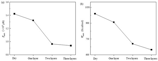 Figure 8 shows the maximum pulling force Fmax and the final work Wmax generated by G debonding on a C-S-H substrate at different water contents. In general, both Fmax and Wmax decreased with an increase in water content. When the interface is Dry (Dry), G is in close contact with C-S-H, and the binding between the two is all due to the van der Waals force between C-S-H and G. When a small amount of water intrudes into the interface (One layer), water forms hydrogen bonds with the surface of C-S-H, which is specifically manifested as the formation of a water film attached to the surface of C-S-H, slightly weakening the binding effect between G and C-S-H, and slightly reducing Fmax and Wmax. When a large amount of water intrudes into the interface (water layer ≥ two), the water molecules attached to the surface of C-S-H play a lubricating role in isolating C-S-H and G, reducing the binding effect between the two, and significantly reducing Fmax and Wmax. As the water content continues to increase, the binding effect between G and C-S-H tends to be zero, that is, G loses its strengthening effect.