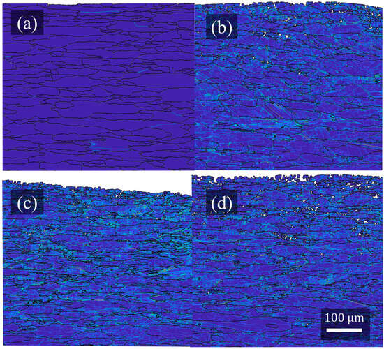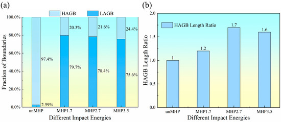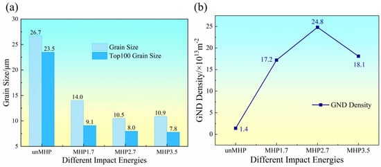 - MHP treatment induces grain refinement and increases the density of GNDs in A7075, especially in the near-surface region. At an impact energy of 2.7 J, the grain size reached its minimum, and GND density was highest, indicating optimal strengthening.