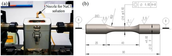 To explore the impact of the combined LSP and HFIQ processes on the material’s corrosion fatigue properties, corrosion fatigue tests were performed using a QBWP-6000J rotating bending corrosion fatigue testing machine (Qianbang, Changchun, China) (Figure 1a). The testing employed a 3.5% NaCl cyclic solution as the working fluid, maintained at a temperature of 52 °C. Four groups of samples (five samples per group) were tested. While all samples had the same shape (Figure 1b), they underwent different processing methods (Table 3).