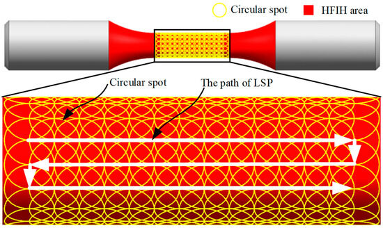 Additionally, samples T-3 and T-4 were subjected to LSP after machining, using a YS1205-R200EB LSP device (Tyrida, Xi’an, China). To ensure a 50% overlap rate on a 6 mm circular path, the spot diameter was set to 2.36 mm. The detailed LSP parameters are listed in Table 5 []. The path of LSP treatment is illustrated in Figure 2.