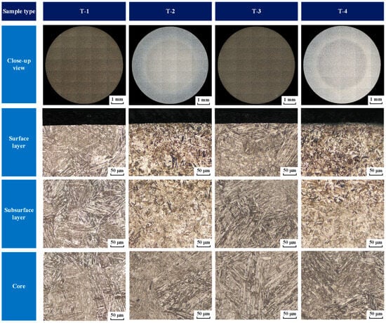 Microstructure of the circular cross-section of T-1, T-2, T-3, and T-4 samples under a confocal laser scanning microscope (CLSM). The microstructure of each sample was observed in four regions: the overall view, surface layer, subsurface layer, and core. The subsurface microstructures for all four sample groups were taken from the region located 0.5 mm beneath the surface layer.