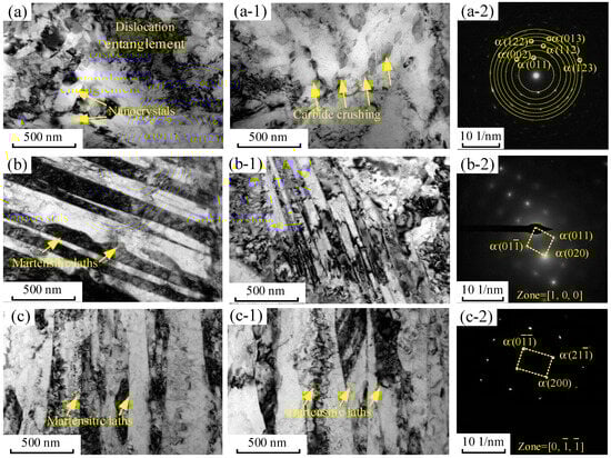 Through TEM analysis of the T-4 sample’s microstructure, it can be seen that the surface layer contains nanocrystals and dislocation entanglement, as shown in Figure 4a. Some carbides are fragmented by shock waves from LSP, evident in Figure 4(a-1), and the ring pattern in the selected area electron diffraction (SAED) image confirms nanocrystal formation, as shown in Figure 4(a-2). The subsurface layer shows martensitic laths with an average width of ~80 nm, illustrated in Figure 4(b,b-1), with the corresponding SAED pattern indicating a single-crystal α phase (Figure 4(b-2)). In the core, martensitic laths with an average width of ~250 nm are present, shown in Figure 4(c,c-1), with the corresponding SAED pattern also displaying a single-crystal α phase (Figure 4(c-2)).