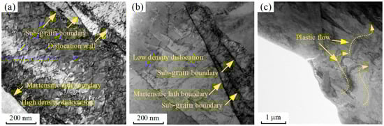 At a depth of 20 μm from the surface, a high density of dislocations, dislocation walls, and sub-grain boundaries is visible, as shown in Figure 5a. At 40 μm from the surface, a lower density of dislocations and sub-grain boundaries is observed, as seen in Figure 5b. At 60 μm from the surface, distinct plastic flow is evident, illustrated in Figure 5c.