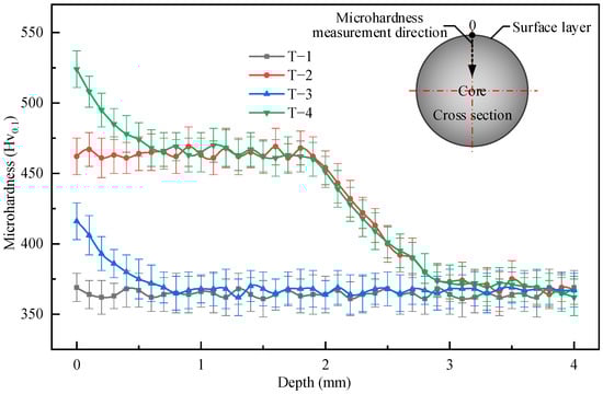As shown in Figure 6, the microhardness of sample T-1 is approximately 361–369 Hv0.1, with no detectable hardness gradient. In sample T-2, a hardness gradient is observed: in the 0–1.9 mm range from the surface to the core, the microhardness is around 462–471 Hv0.1 due to high-frequency induction quenching (HFIQ). This hardness gradually decreases within the 1.9–2.8 mm range, stabilizing at around 364–374 Hv0.1 in the 2.8–4 mm range. For sample T-3, the surface layer shows the highest microhardness, at approximately 416 Hv0.1. The hardness gradually decreases within the 0–0.6 mm range, remaining steady at 364–370 Hv0.1 from 0.6 mm to 4 mm. Sample T-4 exhibits the highest surface hardness, reaching around 524 Hv0.1. The microhardness gradually decreases within the 0–0.7 mm range, while the 0.7–1.9 mm range shows microhardness around 462–471 Hv0.1, also attributed to HFIQ. This value gradually decreases within the 1.9–2.8 mm range, stabilizing at approximately 361–373 Hv0.1 in the 2.8–4 mm range. Overall, the surface hardness of the samples ranks as follows: T-4 > T-2 > T-3 > T-1. T-4 exhibits the largest hardness gradient, with a surface-to-core hardness difference of 163 Hv0.1.