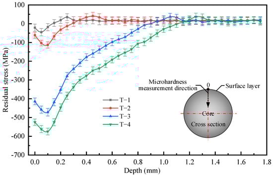Test results indicate that samples T-3 and T-4, treated with LSP, exhibit a significant residual compressive stress field at the surface layer, as shown in Figure 7. In contrast, the surface residual stress in samples T-1 and T-2 is relatively lower. Sample T-3 has an effective residual compressive stress depth of approximately 0.9 mm, with a peak residual compressive stress of around −472 MPa at 0.1 mm from the surface. For sample T-4, the effective depth is about 1.1 mm, with a maximum residual compressive stress of approximately −575 MPa, also located 0.1 mm beneath the surface.