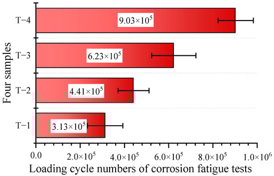 The results of the corrosion fatigue tests show that the cycle counts under loading force, in descending order, are T-4 > T-3 > T-2 > T-1, as illustrated in Figure 8. Comparing T-1 with T-2 and T-3 with T-4, samples treated with HFIQ exhibit higher cycle counts than those without HFIQ treatment. Similarly, comparing T-1 with T-3 and T-2 with T-4, samples treated with LSP show higher cycle counts than those untreated with LSP. Overall, the T-4 sample, which underwent both HFIQ and LSP treatments, achieved the highest cycle count—2.88 times that of T-1, 2.04 times that of T-2, and 1.45 times that of T-3.