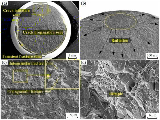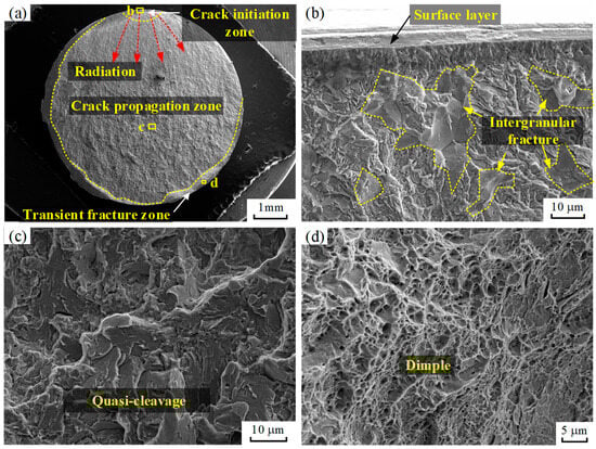 Fracture analysis of the T-4 sample. (a) Overview of fracture morphology. (b) Magnified view of the crack initiation zone in (a), showing the origin located in the subsurface layer. (c) Magnified view of the crack propagation zone in (a), with distinct intergranular and trans-granular fracture features visible in the upper right corner. (d) Magnified view of the transient fracture zone in (a), showing dimple features indicative of plastic fracture.