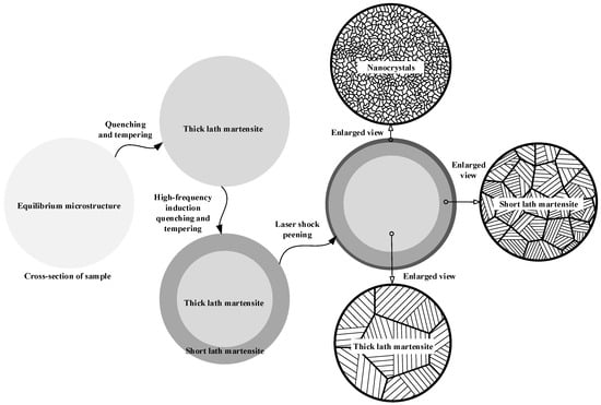 Through a combination of overall quenching, HFIQ, and LSP, a microstructure gradient was developed in the material, as shown in Figure 13. Initially, the material exhibited an equilibrium microstructure, which transformed into coarse lath martensite across the entire material after quenching and tempering. Following HFIQ and tempering, short lath martensite formed in the surface and subsurface layers, while the core retained its coarse lath martensite structure. Finally, LSP refined the grains in the surface layer, producing nanocrystals. Consequently, the final microstructure comprises nanocrystals in the surface layer, short lath martensite in the subsurface layer, and coarse lath martensite in the core. These findings are confirmed by microstructure analysis, as shown in Figure 3 and Figure 4.