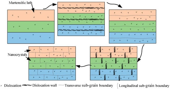 As illustrated in Figure 14, the initiation of the laser shock wave causes the formation and gradual accumulation of dislocation lines within the original grains. These dislocations eventually form dislocation tangles and dense dislocation walls, which transform into sub-grain boundaries. Finally, the high-energy regions created by dislocation interactions drive the recrystallization process, leading to the formation of nanocrystals []. These newly formed grains are finer and exhibit lower dislocation density, effectively refining the original martensitic laths into nanoscale grains. Figure 4 confirms the presence of nanocrystals in the surface layer.