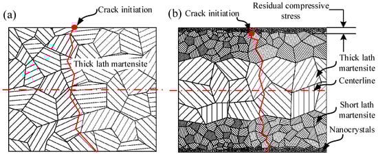 Crack initiation locations. (a) Original sample, with crack initiation at the material surface. (b) The sample was treated with the combined process of laser shock peening and high-frequency induction quenching, showing crack initiation within the material’s interior.
