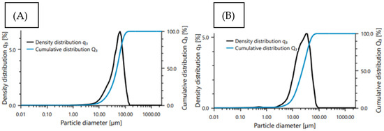 Particles size distribution of the feedstock powder, (A) aluminum powder, (B) titanium powder.