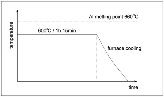 In order to obtain a metallic phase, the Ti–Al coatings were heat treated in laboratory resistance furnaces. The heat treatment was conducted without a protective atmosphere. The process covered annealing at the temperature of 600 °C for 1 h and 15 min, followed by slow furnace cooling. The temperature and time had been selected on the basis of the literature and an experiment. A temperature-time diagram for the heat treatment of composite coatings Ti60-Al40 and Ti70-Al30 is presented in Figure 3.