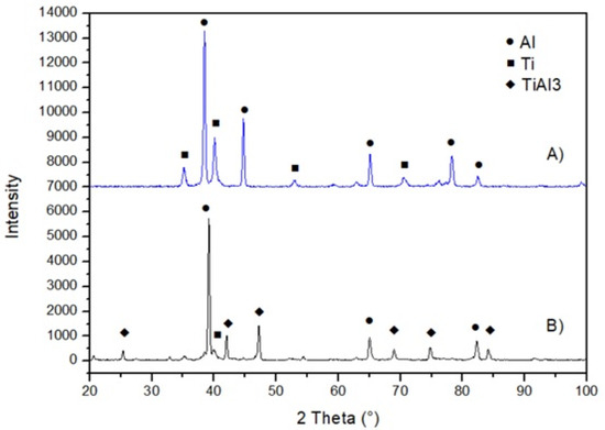 Ti and Al alloys are suitable for harsh operating conditions. They are also characterized by a low density, a high melt temperature and good mechanical properties at high temperatures. Thanks to these properties, they can be used in the aircraft industry, where high material strength and low material weight are of key importance [5,6]. Moreover, one should bear in mind that titanium-based components are expensive to produce because of the high costs of titanium production and are difficult to machine [7,8,9]; therefore, the idea of regenerating titanium elements is an advantageous and eco-friendly solution. In the aerospace industry, which is based on alloys of light metals [10], it is possible to admix the base titanium powder with an aluminum powder during the regeneration of titanium elements, aluminum elements, and their alloys [9,10,11,12,13]. This modification can contribute to a reduction in the oxidation number of the coatings, which translates into better mechanical properties of the coatings and the finished product. Thanks to the admixture of such a ductile material as aluminum, a metallic matrix for the hard and hardly deformable titanium can be created.