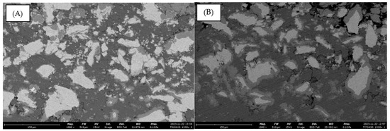 Examinations of the microstructure of the Ti–Al composite coatings before and after heat treatment revealed a compact homogenous structure (Figure 7A,B). The coatings were found to adhere continuously to the substrate, and small porosity in their structure was discovered. The incompletely formed light particles of hard titanium (the light phase) were immersed in the matrix of soft plastic aluminum (the dark phase), forming a composite coating with a high degree of fit. In the coatings with less titanium, the titanium phase particles were found to be uniformly distributed, whereas in the case of more titanium, the titanium particles formed interconnected clusters.