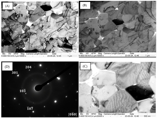 The transmission electron microscopy of the composite coatings after LPCS revealed a diphase structure (Figure 10A,B). Both the lighter aluminum grains and the darker titanium grains exhibit a coarse-grained structure and a high degree of cohesion. A large accumulation of dislocations of various characteristics is visible in the titanium grains area. Dislocations are observed both within titanium grains, in the form of semicircles oriented towards the interphase boundary, and in the form of dislocations piled up on the interphase boundaries (Figure 10C,D). In the case of aluminum grains, dislocation pile-ups are visible on the same-sign aluminum boundaries.