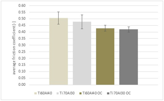 Tribological tests were carried out both before and after heat treatment [26]. Their results for the load of 20 N showed that a percentage increase in titanium content in the coating caused a decrease in the coefficient of friction (Figure 12). The increased presence of phase Ti results in the worsening of the thermal properties and a decrease in the friction coefficient to the value of 0.48 in the Ti70Al30 coating in comparison with the value of 0.5 for the Ti60Al40 coating. The friction coefficient results for the heat-treated composite coatings containing intermetallic phase TiAl3 also showed a decrease in the coefficient of friction. The Ti percentage content in the heat-treated coating showed a reverse tendency. A minimal decrease in the friction coefficient value from 0.43 for the 60%Ti samples to 0.42 for the 70%Ti samples was noted.