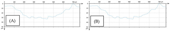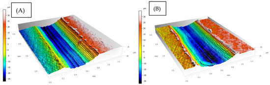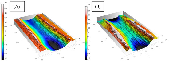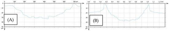 Profile of roughness after friction process for composite coating after heat treatment: (A) Ti60Al40 OC, (B) Ti70Al30 OC.