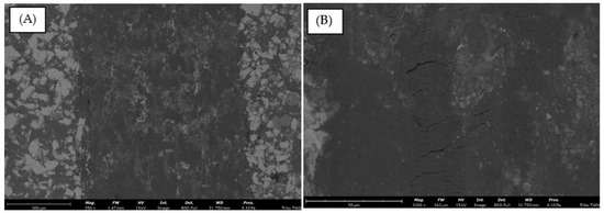 SEM examinations of the groove revealed that the investigated coatings had undergone plastic deformation (Figure 17A,B). The abrasions are characterized by the plastic deformation of the material in contact with the ball. Smaller close-ups of the abrasions (Figure 16) show a higher aluminum matrix fraction than that observed in this area before the test. This can be explained by the Orowan mechanism because of the presence of Ti and TiAl3 layers, which are harder than the matrix (also, their moduli of shear are higher) and so exhibit low cohesion with the latter. Hence, during deformation it is mainly the Al particles that are dislocated and smeared over the whole volume of the groove. A greater close-up reveals gaps in the matrix structure (Figure 18A,B). Since this defect occurs between undeformed Ti and TiAl3 particles, it is concluded that it is in the Al particles that undergo deformation that stress pile-ups occur.