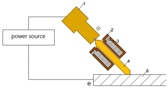 This is composed of the current source (the plasma generator), which in most cases provides direct current; the electric arc is formed between the electrode (1), included in a welding torch, and the base material (5). Due to the constructive form of the nozzle (2) cooled with a cooling agent (3), a part of the column of the arc (4) undergoes a constraint which is able to increase the temperature to the point where a plasma arc with high temperature is obtained and at even supersonic speeds, as can be seen in [12,13,14,15].