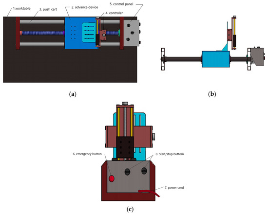Linear advance device used for the mechanization of the plasma gouging process: (a) top view, (b) front view, (c) side view.
