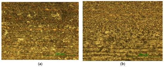 The microstructure of the gouged piece with plasma: (a) manually, (b) mechanized, 500× magnification (100 µm scale).