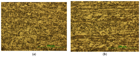 The microstructure of the base material zone of the workpiece by gouging with plasma: (a) manually, (b) mechanized, 500× magnification (100 µm scale).