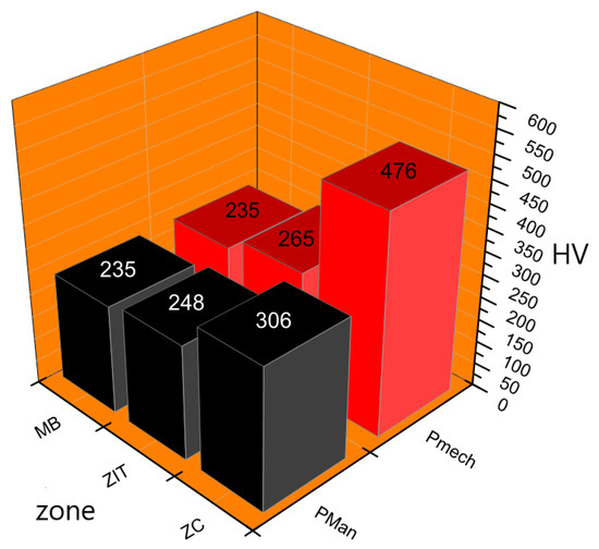 The testing was performed at a load of 100 g/force on the scale of HV10 was used in order to determine the hardnesses of the manually and mechanized plasma-gouged surfaces. This equipment comprises of a data acquisition system and special software for the automatic measurement of microhardness. For each sample, five measurements were performed in the three distinct zones, i.e., the gouged zone, the intermediate zone, and the base material zone. Figure 10 shows the arithmetic mean value of the measured hardnesses. The Scanning Electron Microscope image of the manually operated plasma-gouged surface is presented in Figure 11.