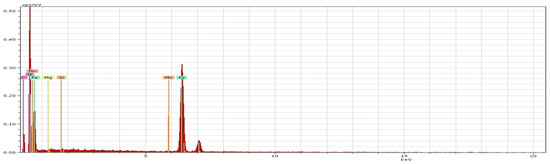 EDAX spectrum obtained for the mechanized plasma-gouged (PMechG) sample. On the vertical axis, the concentration [%] varies from 0 to 0.3%. On the horizontal axis, the layer’s spectrum range level [keV] varies from 0 to 20 keV.