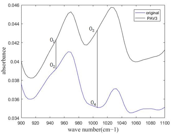 During the aging process of asphalt, the absorbance peak strength of certain functional groups may increase. Therefore, based on the Lambert–Beer law, quantitative analysis of the FTIR spectra of asphalt binders can be performed []. Currently, there is no unified standard for the quantitative analysis of FTIR data of asphalt binders. Many studies use the peak area of absorbance peaks for analysis. To establish a stable and systematic FTIR spectroscopic quantitative analysis method, this study plans to select different spectral areas as reference benchmarks. As shown in Figure 1, the area enclosed by O1, O2, O3, and O4 is used as the reference point to calculate the difference in the infrared spectra between aged asphalt and original asphalt in the 900–1020 cm−1 range. By systematically comparing the influence of different reference benchmarks on the quantitative analysis of the infrared spectra of asphalt at different aging levels, a method for quantitative analysis of asphalt infrared spectra will be established. Through the quantitative analysis of infrared spectra of aged asphalt during the aging process, the aging law of asphalt and the prediction of changes in performance indicators of asphalt will be studied.