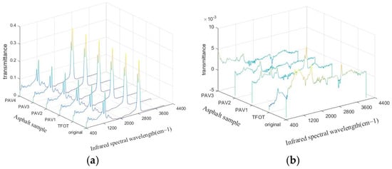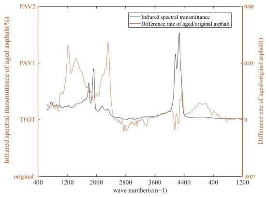 In order to accurately compare the spectral difference curve and the original value curve, the PAV-4-original difference curve is compared with the original asphalt curve. As shown in Figure 4, the blue curve represents the original spectral curve of asphalt, and the red curve represents the difference curve. It can be concluded that the difference curve has 4 peaks, with two major peaks (800–1300, 1600–1750) on both sides of the original curve peak at 1400, and the position of the peak in the original curve is exactly the valley in the difference curve. However, the overall difference in the 600–1750 wavenumber range is relatively high (about 3/4 of the whole curve) when viewed in full spectrum, which can achieve a more stable area calculation value. The local band difference curve is negative, indicating that the value of the difference spectral transmittance may decrease locally during the aging process.