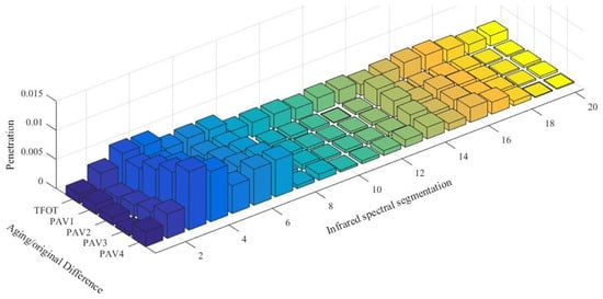 The asphalt spectrum varies greatly in different spectral regions. In order to accurately analyze the changes in the asphalt spectrum, this paper conducts a segmented study of the spectrum, and the results are shown in Figure 5, comparing the spectra of aged asphalt and original asphalt. The spectra of asphalt aged in the short term cannot be analyzed together with asphalt aged in the long term and require separate research. The regularity of asphalt aged in different age periods in the long term is very good, with a stable increase in the difference values, and the results of the subdivision comparison indicate that the curves in the 600–1600 wavebands have large values and stable growth rates, showing the best regularity. It indicates that in the long-term aging process, the infrared curve of asphalt varies regularly, and the analysis of infrared spectra of aged asphalt can well characterize the aging process of asphalt.