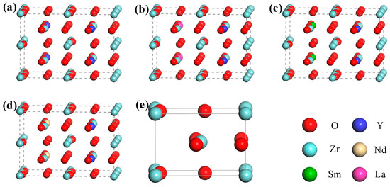 Theoretical calculation models of rare earth element doped YSZ: (a) YSZ supercell; (b) LaYSZ supercell; (c) SmYSZ supercell; (d) NdYSZ supercell; and (e) tetragonal phase ZrO2 base cell.