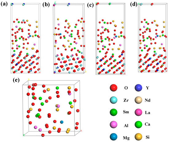 Theoretical calculation models of CMAS corrosion: (a) CMAS/YSZ interface model; (b) CMAS/LaYSZ interface model; (c) CMAS/SmYSZ interface model; (d) CMAS/NdYSZ interface model; and (e) amorphous CMAS crystal cell.