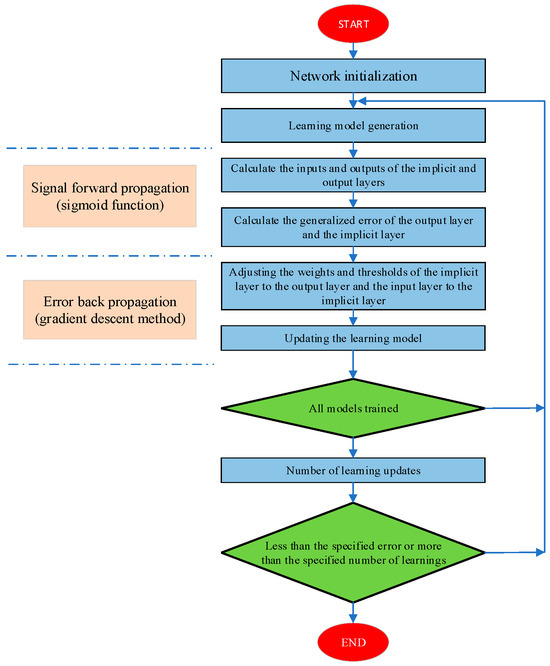 BP neural network is a classic machine learning algorithm; the principle is to train the network through the backpropagation algorithm according to the difference between the actual output and the desired output to optimize the network’s weights and bias, with the advantages of having simple structure, being easy to use, and being widely applicable [23,24]. The basic flow of the BP neural network was shown in Figure 3, and the algorithm covered the two main processes of forward propagation of the signal and backpropagation of the error. The former generally used the sigmoid transform function to construct a nonlinear mapping network between the input and output signals and transferred to the error backpropagation process by calculating the generalized error between the actual output and the desired output. This process apportioned the error to all units in each layer and used the gradient descent method and other methods to find the optimal combination of node connection weights and thresholds in each layer so as to minimize the overall network mean square error. In general, researchers controlled the network generation by specifying the error precision or the maximum number of learning times, with an intention to accelerating the network convergence and avoiding the dilemma of local optimum.