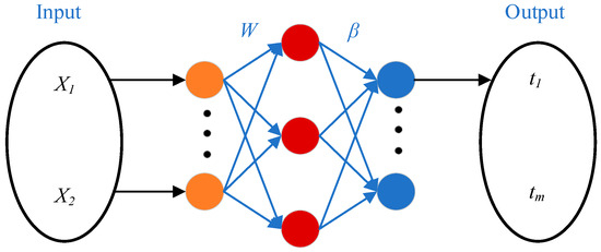 Extreme learning machine (ELM) was a new type of single hidden layer forward network with excellent performance proposed by Huang Guangbin [25] in 2006 based on generalized inverse matrix theory. Compared with traditional neural networks, the output weights of the network could be resolved by only one step of calculation, which greatly improved the generalization ability and learning speed of the network, have strong nonlinear fitting ability, and greatly reduced the amount of computation and search space. The structure of ELM was shown in Figure 4, which consisted of three parts: the input layer, the hidden layer, and the output layer. The input and hidden layers were connected by input weights W and hidden layer bias b. The hidden layer and output layer were connected by output weights β. For an ELM with the number of hidden layers L, assuming the training set Xj = [x1,x2,…,xN]T∈Rn and Tj = [t1,t2,…,tn]T∈Rm, the computation process of the ELM could be expressed as follows [26]:
