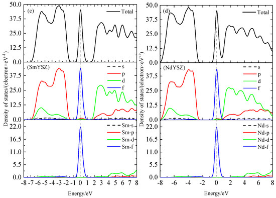 The density of states (DOS) indicated the number of electrons allowed per unit energy range, i.e., the distribution of electrons in a certain energy range, reflecting the distribution of electrons in individual orbitals and interatomic bonding properties. To further understand the inter-orbital interactions between the model atoms under the effect of rare earth elements, the total DOS and partial density of states (PDOS) of the four doping systems were obtained using data processing. The calculation results were shown in Figure 6, where the dashed part represents the Fermi energy level, and the density of states curves of the REYSZ phases were not significantly different, indicating that no obvious change in the energy level structure was found, and none of the electronic density of states were zero near the Fermi energy level, indicating that all REYSZ phases exhibit metallic properties. As shown in Figure 6, the total density of states for the entire valence band energy was mainly provided by the p and d orbitals, at −5 to 0 eV by the p orbitals and at 0 to 10 eV by the d orbitals. In general, when studying crystalline materials, the relative stability of the material could be obtained by comparing the electronic density of states N(EF) at the Fermi energy level, and the smaller the value of N(EF), the more stable the structure was, and the ordering of N(EF) was LaYSZ < YSZ < NdYSZ < SmYSZ, which was in agreement with the enthalpy of formation results. As shown in Figure 6, the N(EF) values of the two phases YSZ and LaYSZ were closer to each other, with the p-orbitals providing the energy near the Fermi energy level, and the doped rare earth elements Y and La contributing less to the Fermi energy level. The N(EF) values of the two phases NdYSZ and SmYSZ were closer to each other than the former two, and the stability of the structure decreased with the difference in the f orbitals, which were not present in the former two, providing the Fermi energy level. Near the Fermi energy level was a larger contribution to the total density of states by the rare earth elements Nd and Sm.